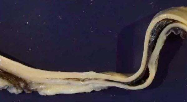 Here you can see there’s specimen of the main vessel of the aorta, and on the left side you see the wall is still coherent, and then there’s a split and there are actually two parts of the wall and in the middle the dark is blood. This person died of a rupture of the aorta.