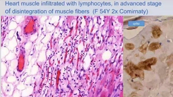 We focused on those structures that are not renewables, so this is the heart. We already heard about the myocarditis and you see the destruction by lymphocytes, and on the right side the demonstration of the spike protein.