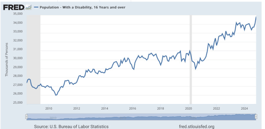 As well, the insurance industry reports that US workers reporting disabilities has skyrocketed 35% since 2021, explaining only that it is a “baffing rise.”