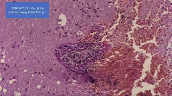 Here you can see this is a needle biopsy from the brain, and you see in the middle a vessel with the dense infiltration of lymphocytes and the necrosis and bleeding in the surrounding.